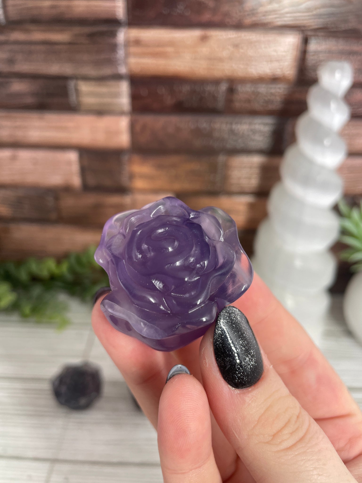 (1) Fluorite rose carving measuring approximately 1.5 x 1.5 inches