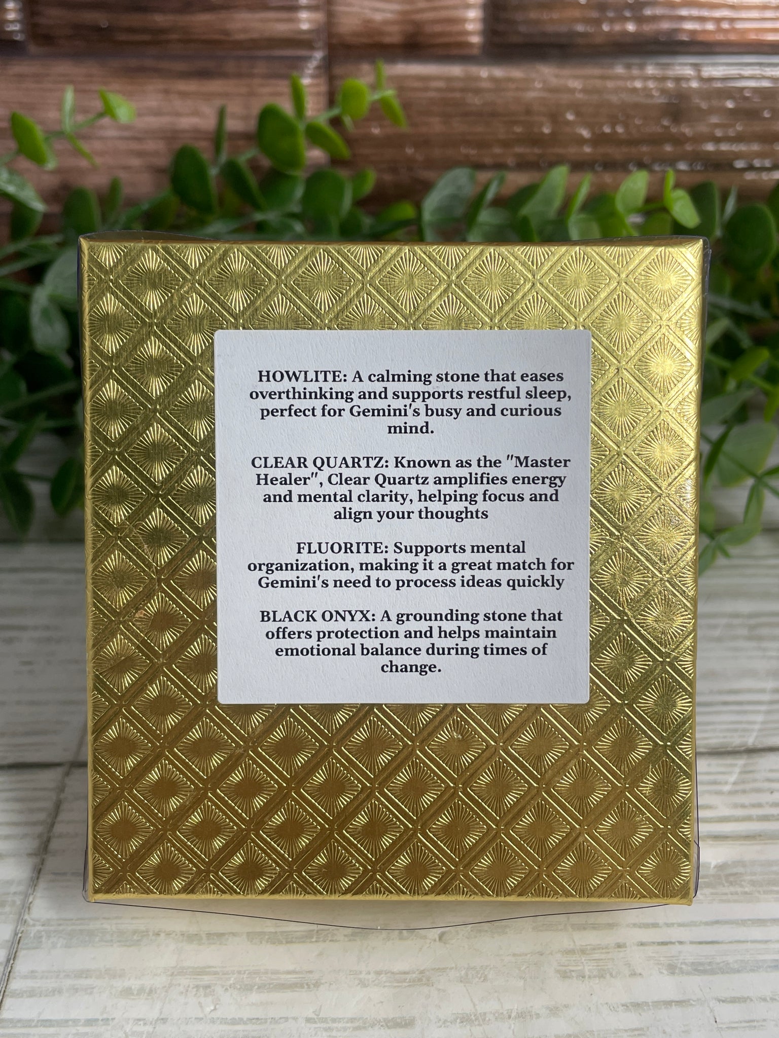 In the Gemini Zodiac Kit you will find Howlite, Clear Quartz, Fluorite and Black Onyx