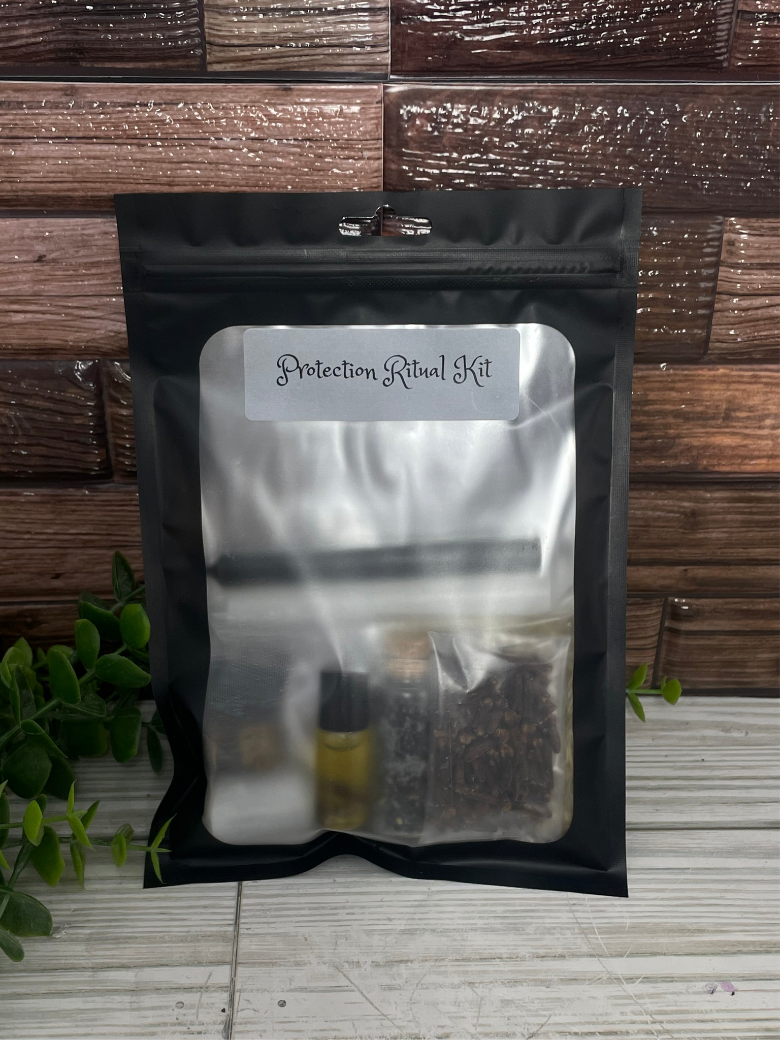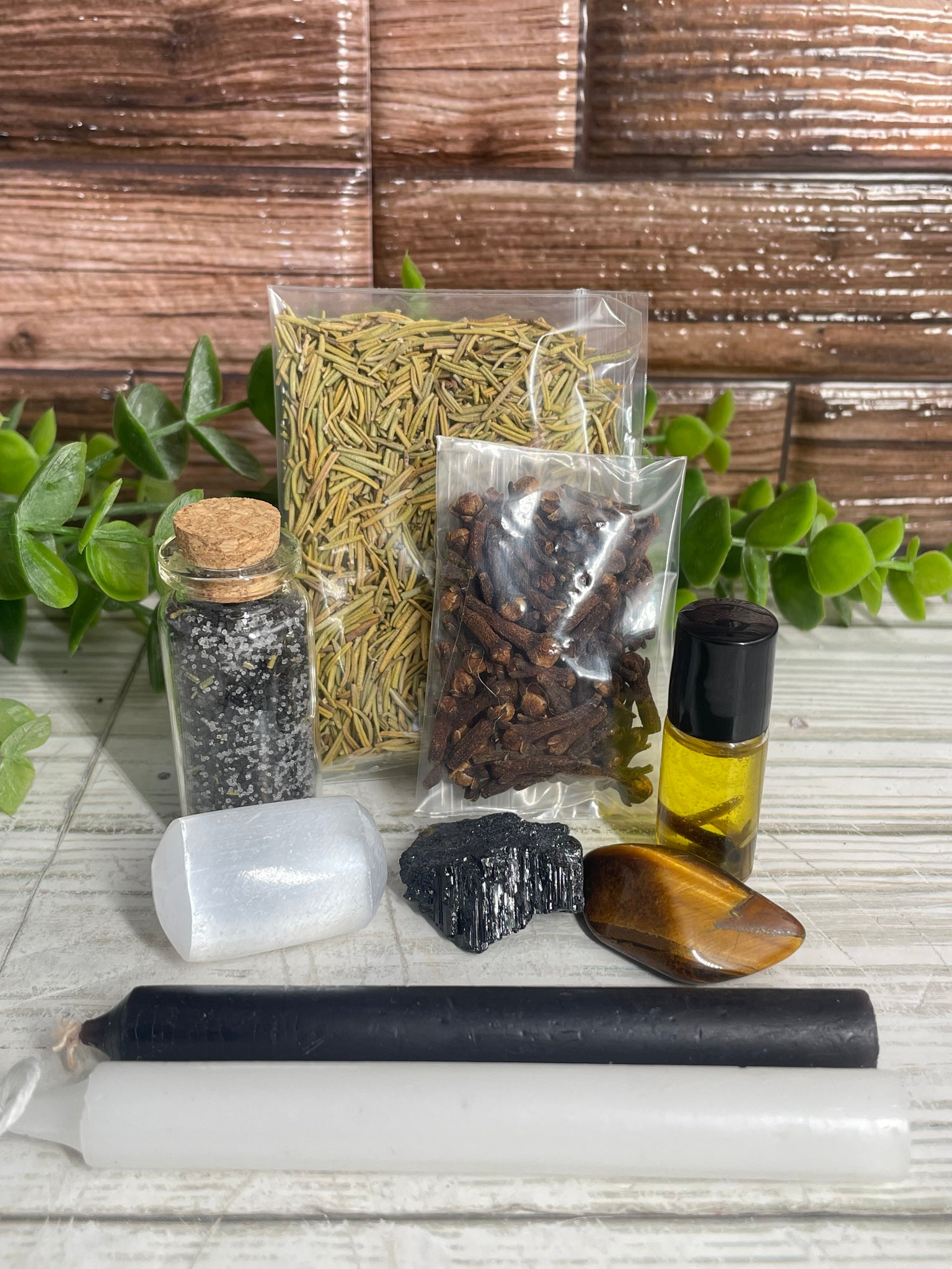 Each kit includes: Rosemary, Cloves, Black salt, Protection ritual/perfume oil, Selenite, Tigers Eye, Black Tourmaline, and a black & white candle.