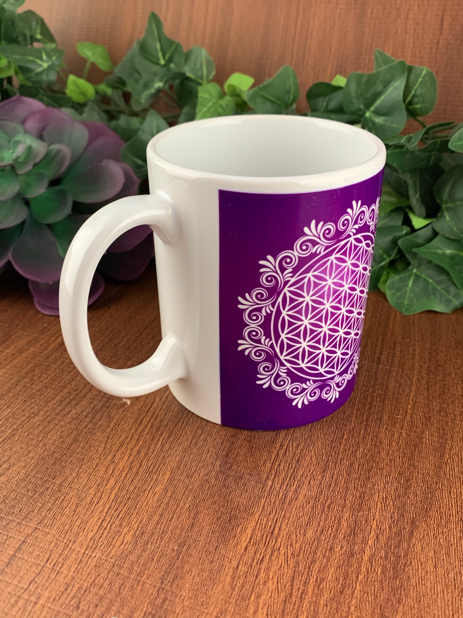 A high quality, 8 ounce ceramic mug. This mug is purple and white with a flower of life design. It is recommended that this item be hand washed.