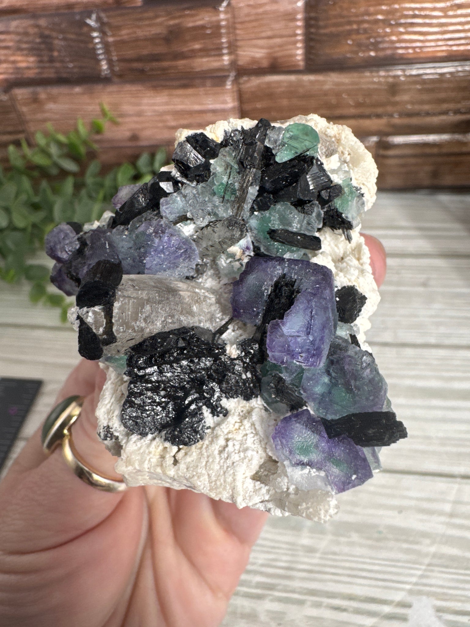 Raw Black Tourmaline and Fluorite Specimen on the Matrix